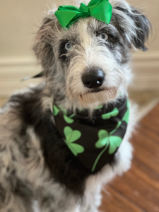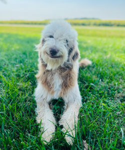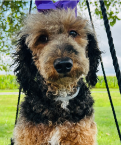 Copper is our stunning ombré chocolate tri F1 Aussiedoodle, known for his laid-back temperament and friendly nature. He greets everyone he meets with a happy smile and his signature little snort, instantly winning hearts.
